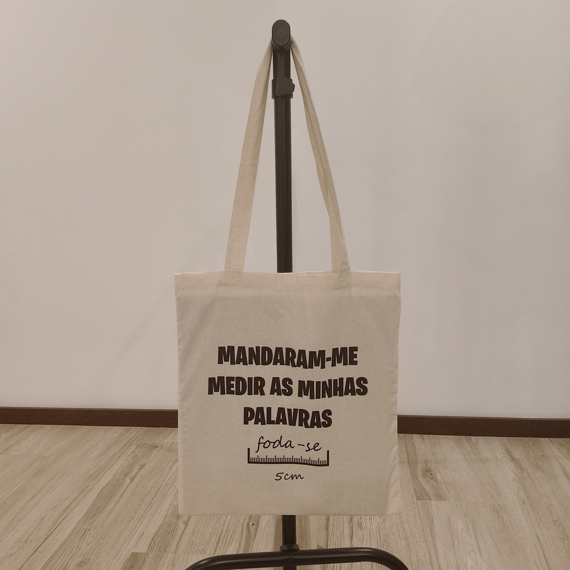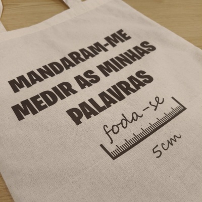 Saco Tote "Medir as palavras" 9,90 € Desconto de %. Partilhar Comprar Contactar Saco Tote "Medir as palavras" Saco estilo Tote com frase Saco de alças 135 g/m²· Canvas, 100% algodão· Alças longas na mesma cor do artigo· Costuras reforçadas· Capacidade: 8LMedidas: 40x38 cm IMPORTANTE: Confirme todos os detalhes (nomes, datas, etc.) antes da aprovação, pois alterações após produção poderá exigir novo pagamento